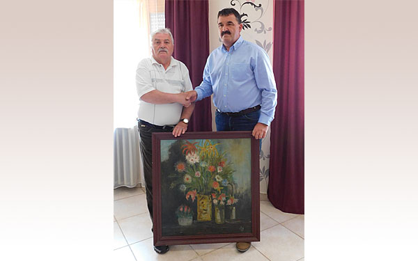 Dombóvár Város Önkormányzatának képviseletében Pintér Szilárd polgármester és Futó Péter önkormányzati képviselő vették át a festőművész alkotásait, melyek keretezés után kerülhetnek a város intézményeibe.