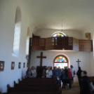 Itt vásárolt ingatlanokat többek közt Dr. Balogh Mária MTA történész is, aki az 1786-ban felszentelt evangélikus templomban várta csoportunkat. A sváb falvak történetében ritka-ságként említette, hogy egyszerre két felekezet van jelen, a lakosság kétharmada evangélikus, harmada katolikus vallású német. Evangélikus fiú sosem házasodott pápista lánnyal, valamint a népviseletükben is különbségek mutatkoztak. Megtekintettük a katolikus templomot is, me-lyet 1941-ben szenteltek fel. 1947 törést jelentett a lakosság életében, a II. világháborút lezáró békeszerződések következtében lakhelyükről kitelepítették a német ajkú lakosságot. 1949-ben a szerencsésebbek visszatértek, és munkát vállalhattak.